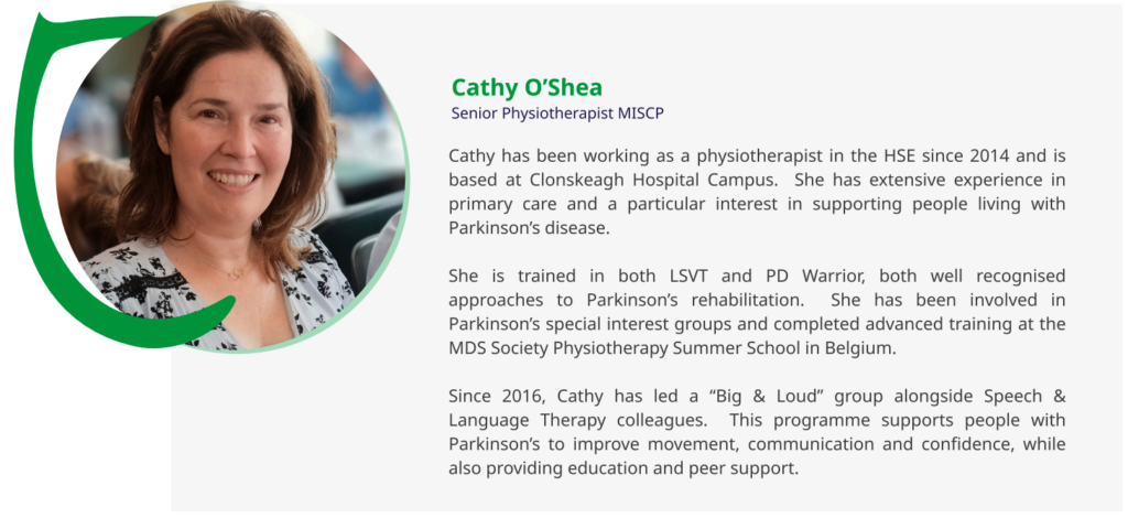 11.15 – 11.45 Supporting Life with Parkinson’s: The Role of Community Physiotherapy -Cathy O’Shea